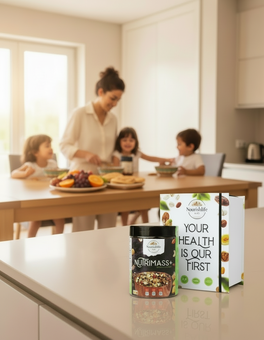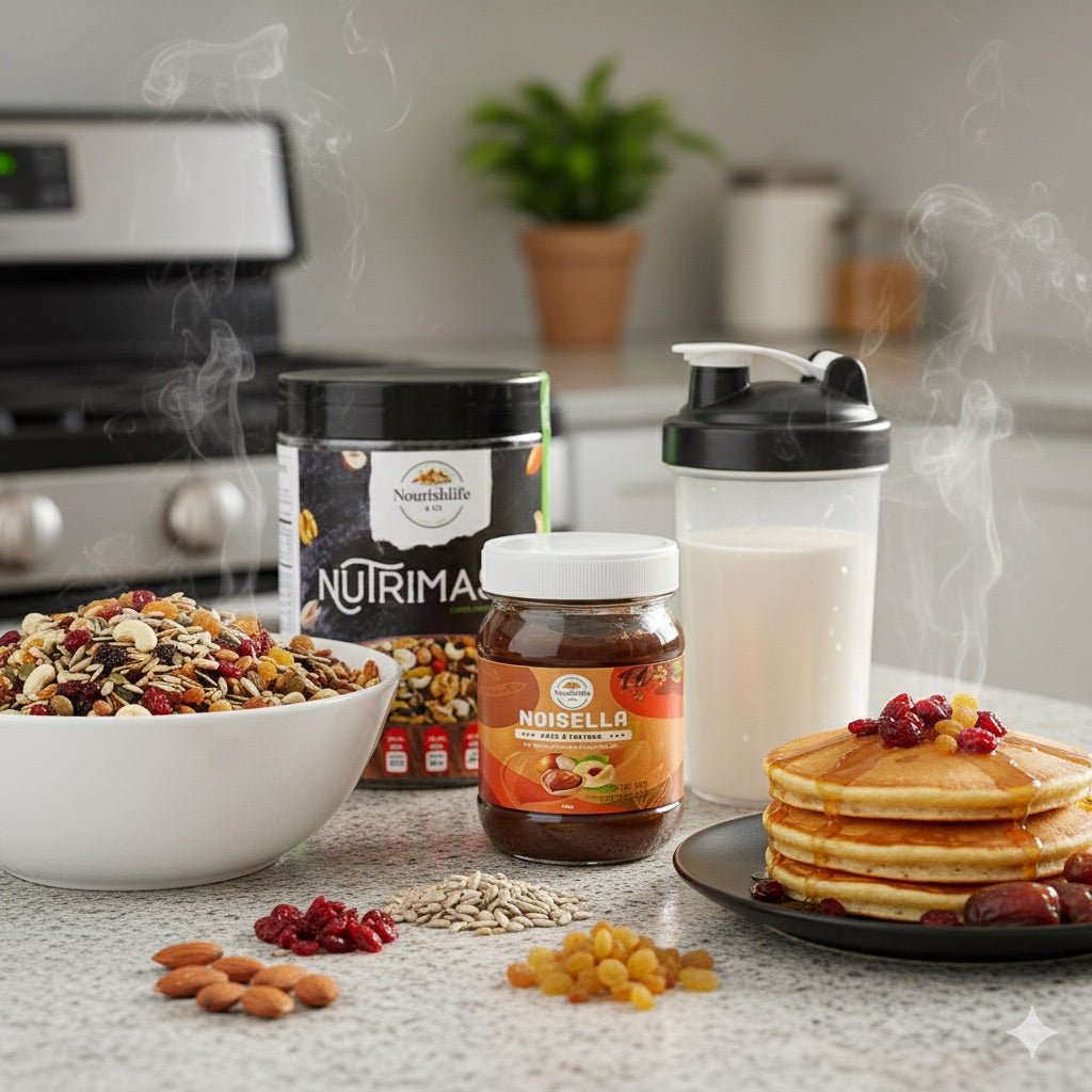 Mélangez 2 cuillères à soupe de NUTRIMASS+ dans votre yaourt, smoothie ou lait le matin. Vous pouvez également le saupoudrer sur vos pancakes ou granola pour un boost nutritionnel complet avec 32 nutriments essentiels.