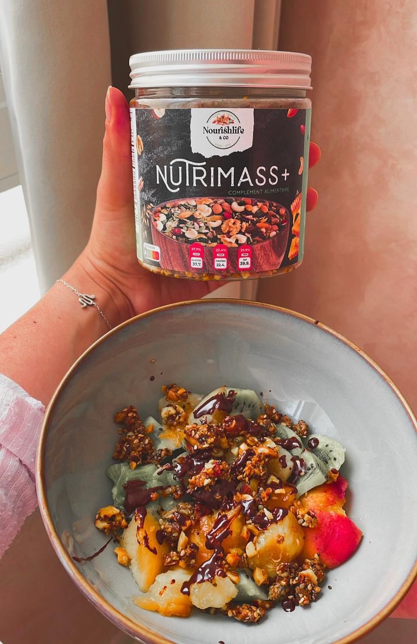 Mélangez 2 cuillères à soupe de NUTRIMASS+ dans votre yaourt, smoothie ou lait le matin. Vous pouvez également le saupoudrer sur vos pancakes ou granola pour un boost nutritionnel complet avec 32 nutriments essentiels.