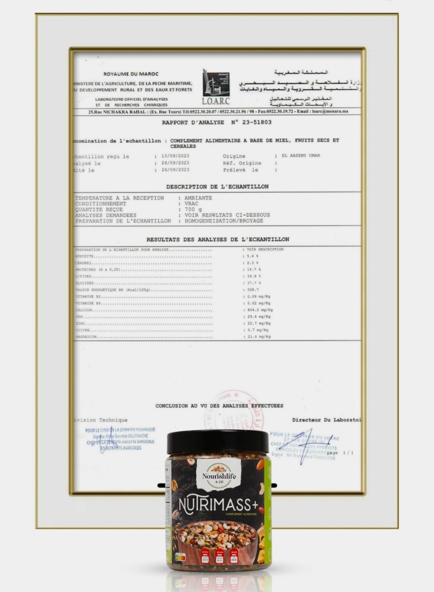 Chaque lot de NUTRIMASS+ est analysé par le LOARC (Laboratoire Officiel d'Analyses et de Recherches Chimiques), laboratoire indépendant marocain. Notre certificat confirme la présence des 32 nutriments essentiels, l'absence de contaminants et métaux lourds, et la conformité aux normes de sécurité alimentaire. Transparence garantie.