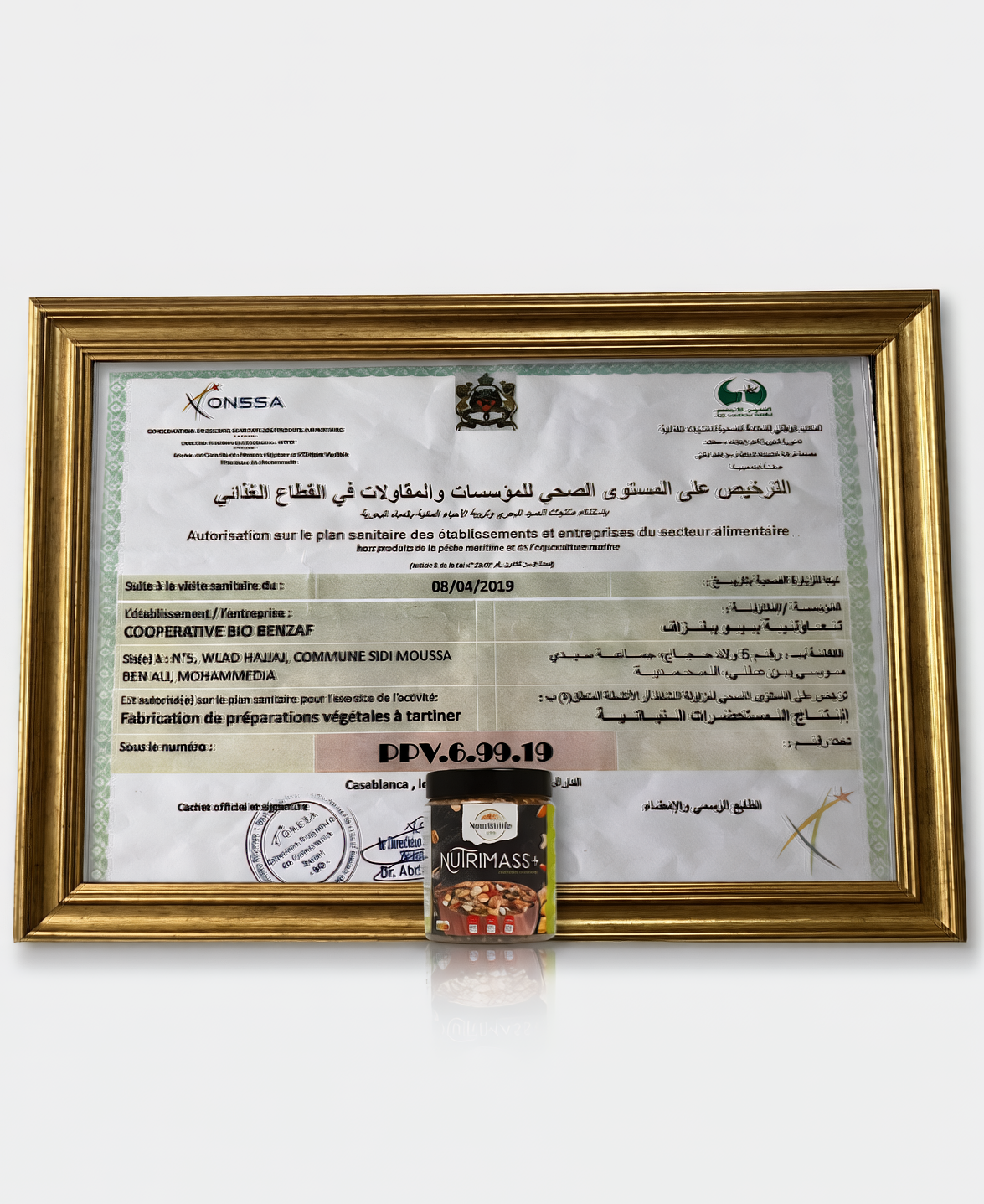 NUTRIMASS+ est fabriqué dans un établissement autorisé par l'ONSSA (Office National de Sécurité Sanitaire des Produits Alimentaires), l'autorité marocaine de contrôle alimentaire. Cette certification garantit que notre processus de fabrication respecte les normes sanitaires les plus strictes et les bonnes pratiques de production. Qualité et sécurité contrôlées à chaque étape.